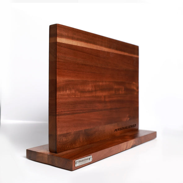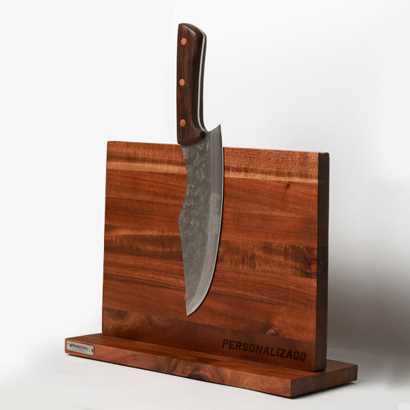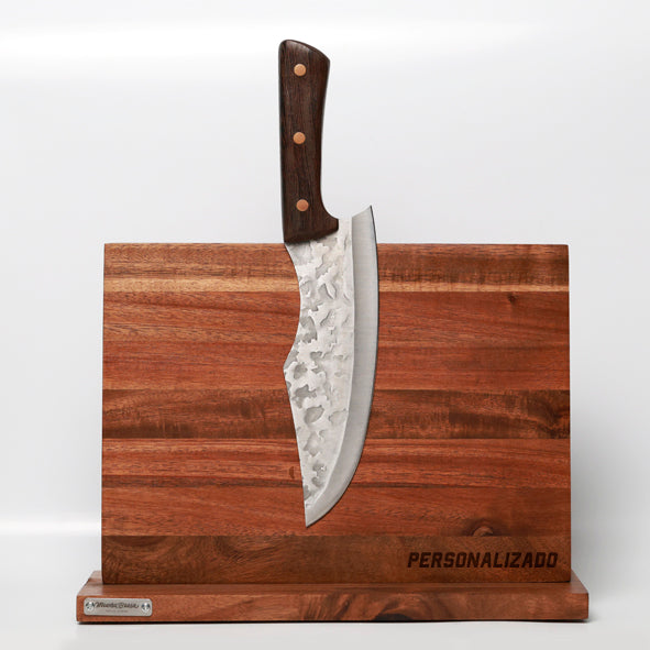 Cuenta con un imán de alta potencia que mantiene tus cuchillos firmes, organizados y siempre al alcance de la mano. Además, puedes personalizarlo con nombre, frase o logotipo, convirtiéndolo en una pieza única, ideal para uso personal o como regalo parrillero.